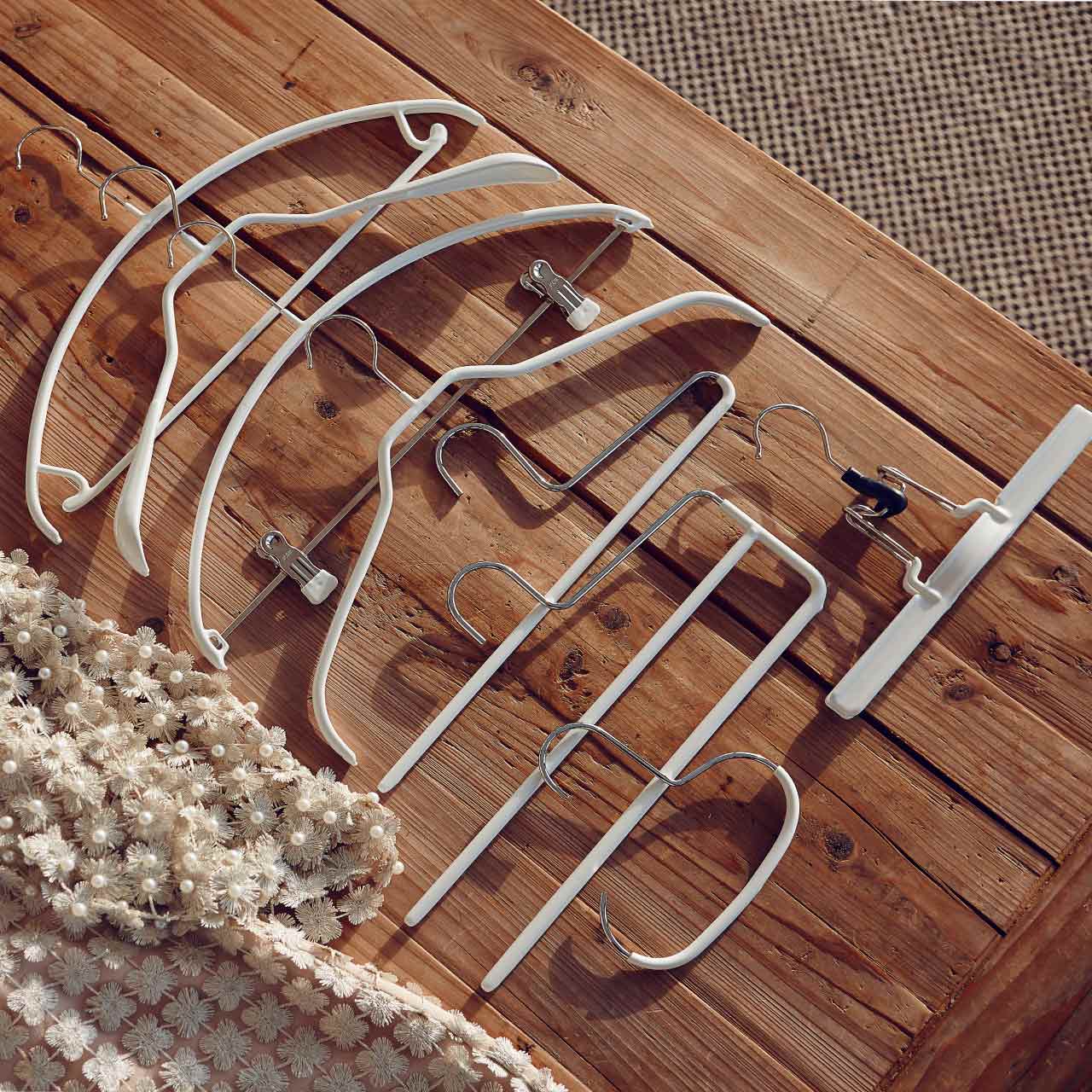 女性用のデリケートな衣装でも特殊コーティングによってすべらないマワハンガーなら型崩れから守ってくれます。収納しづらい小物やアクセサリー類もすっきりと収納できるようなハンガーをチョイスしています。