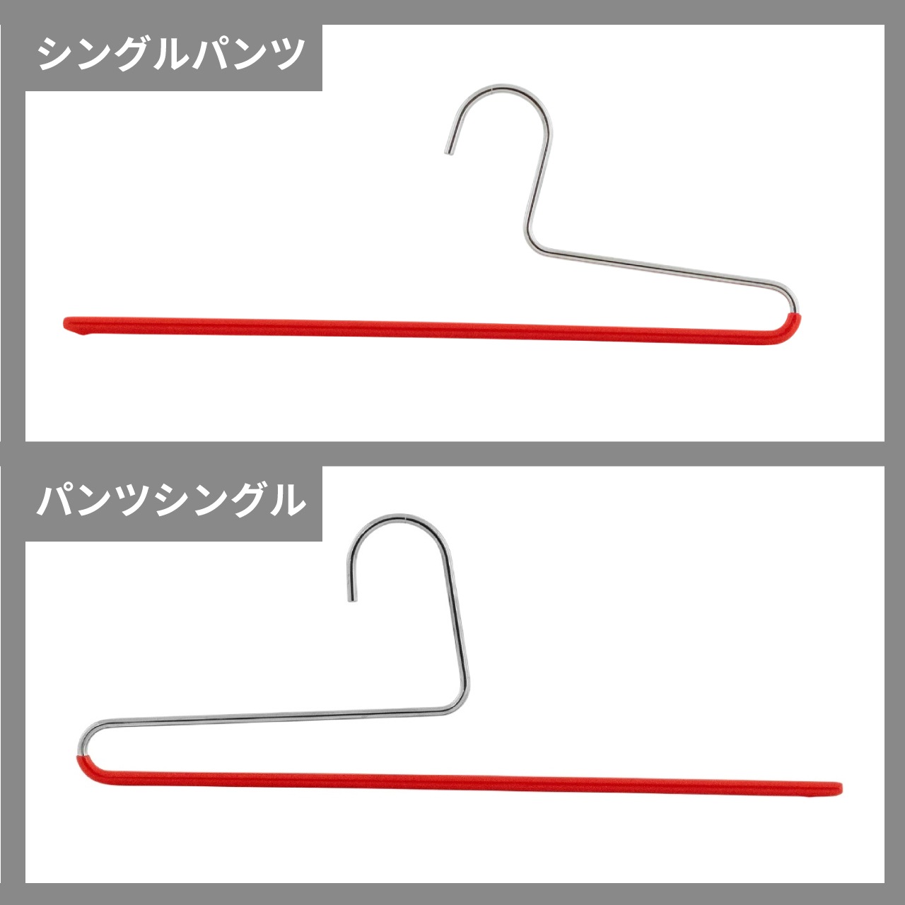 シングルパンツはフックとハンガー開口部が同じ向きの、クローゼットから取り出しやすいタイプですが、ハンガー開口部とフックが逆向きの「パンツシングル」も人気のアイテム。こちらは、衣類だけを取り出しやすく設計されています。